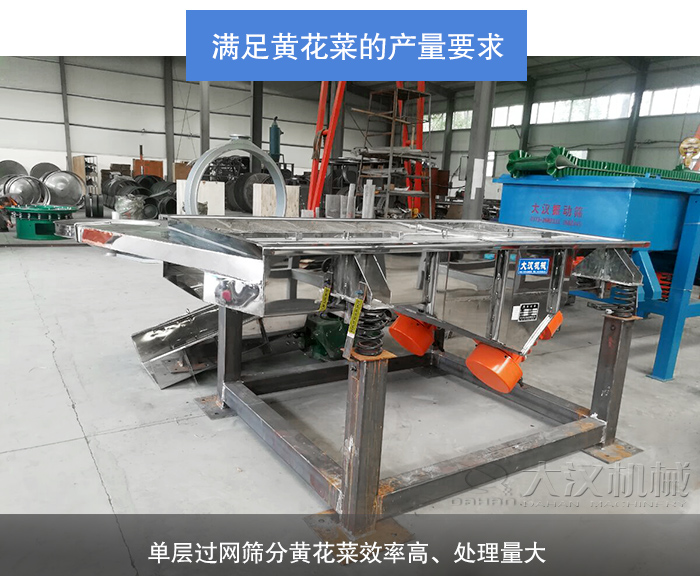 所有振動篩分設備中安裝單層篩網的機器是效率高、篩分處理量大的設備,不同的用戶、企業對黃花菜的篩分處理量要求也是不同的,大漢機械所生產的能篩分黃花菜的直線振動篩有多種型號,產量小的就用小型號直線振動篩(如:515、520型等);產量的就用大型號直線振動篩(如:1530、1540型等)您的準確篩分處理產量也是影響黃花菜直線振動篩選型的重要參考。