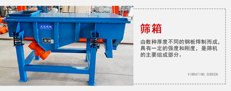 直線振動篩內部結構由:振動電機,導力板,防塵蓋,進料口,篩箱,篩網。