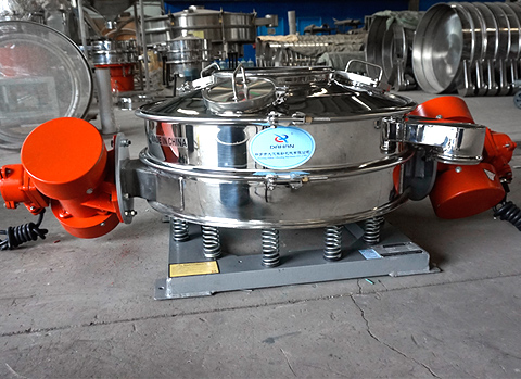 直排篩利用振動電機利用其軸上下端的兩組偏心塊(不平衡偏心塊)的相位角以及兩臺電機之間的交叉角度將振動電機的旋轉運動變為水平、垂直、傾斜以及離心作用的多作用力重疊,再將這種作用力傳遞給篩面,從而達到篩分的目的。改變上下偏心塊的相位角和重量,可以改變激振力的大小和物料的運動軌跡。